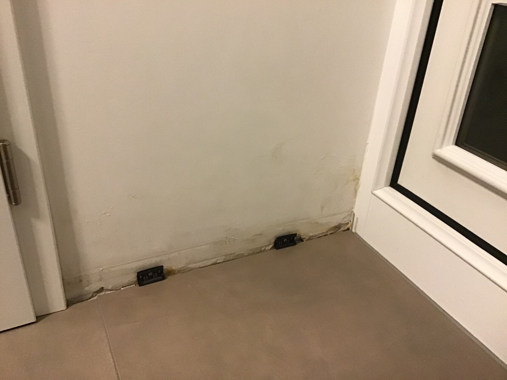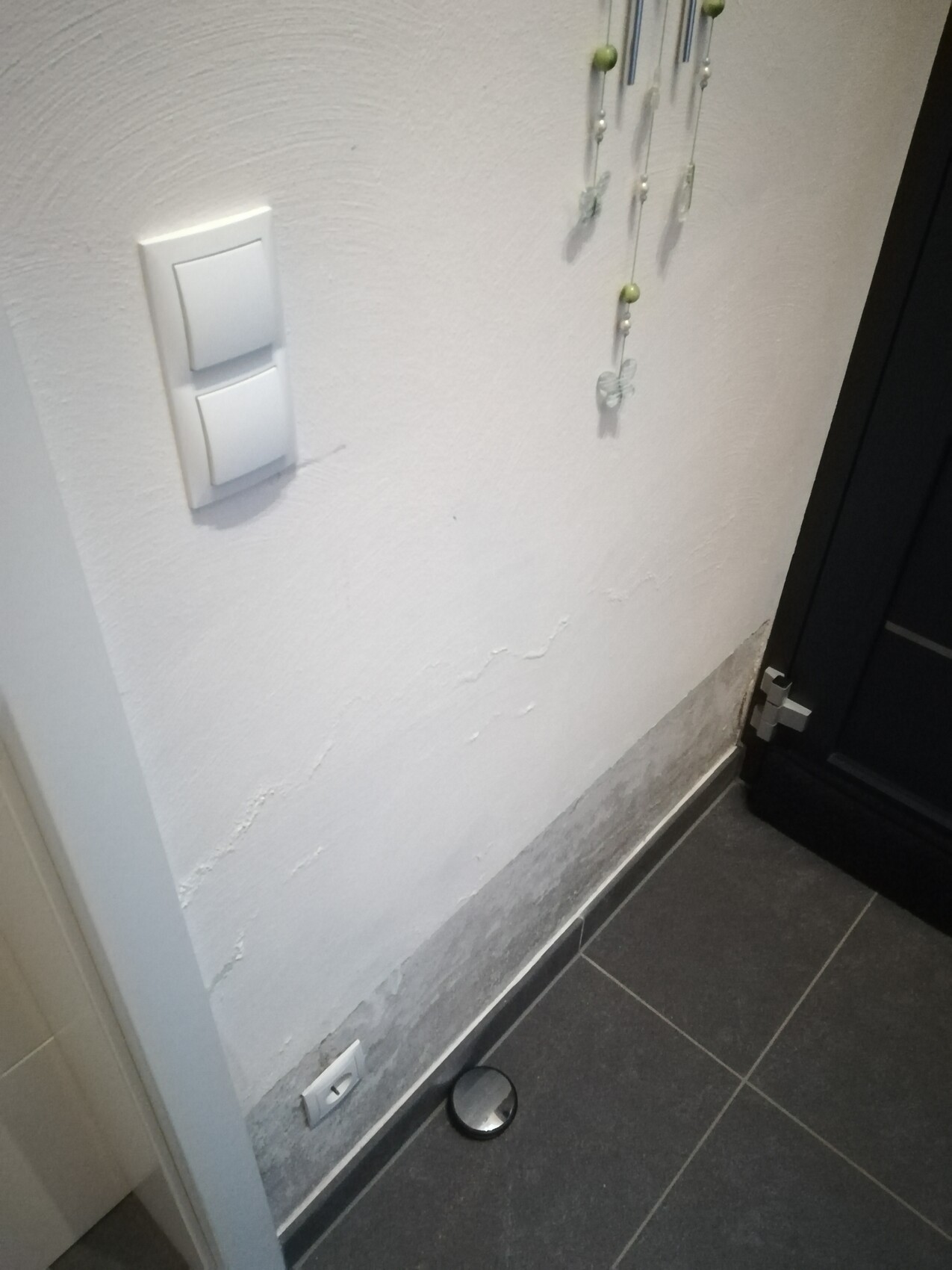 wir sind soeben auf Ihren Post gekommen und haben exakt das gleiche Problem. Das Feuchtigkeitsbild sowie die Räumlichkeiten sind identisch. Wir hoffen das sie die Ursache des Problems für Ihren Schaden gefunden haben und würden uns freuen wenn sie Ihre Erfahrungswerte mit uns teilen könnten. Für uns kommen im Grunde 2 Möglichkeiten in Frage: Dichtung an der Haustüre defekt oder Schaden im dahinter liegenden WC, wobei in der Zwischenwand keine Wasserleitung vermutet wird. Könnte dennoch sein das der Unterputzspülkasten bzw. die Leitungen am WC das Problem verursachen, die Feuchtigkeit aber nur auf der Flurseite austritt ( Fliesen im WC ). Über eine Rückmeldung würden wir uns freuen.