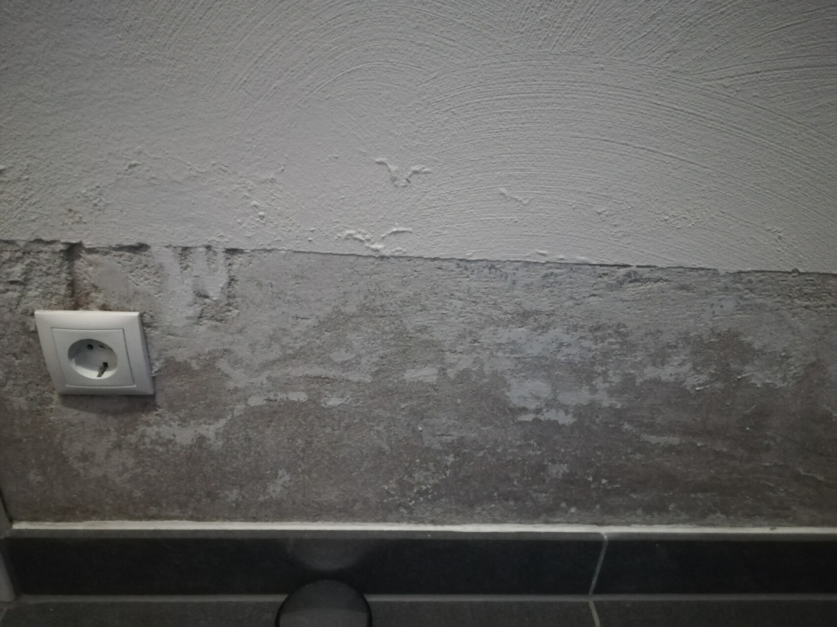 Für mich schaut es aus als ob der Putz Feuchtigkeit von unten aufsaugt. Evtl. die Abdichtung der Haustür im Sockelbereich nicht OK?