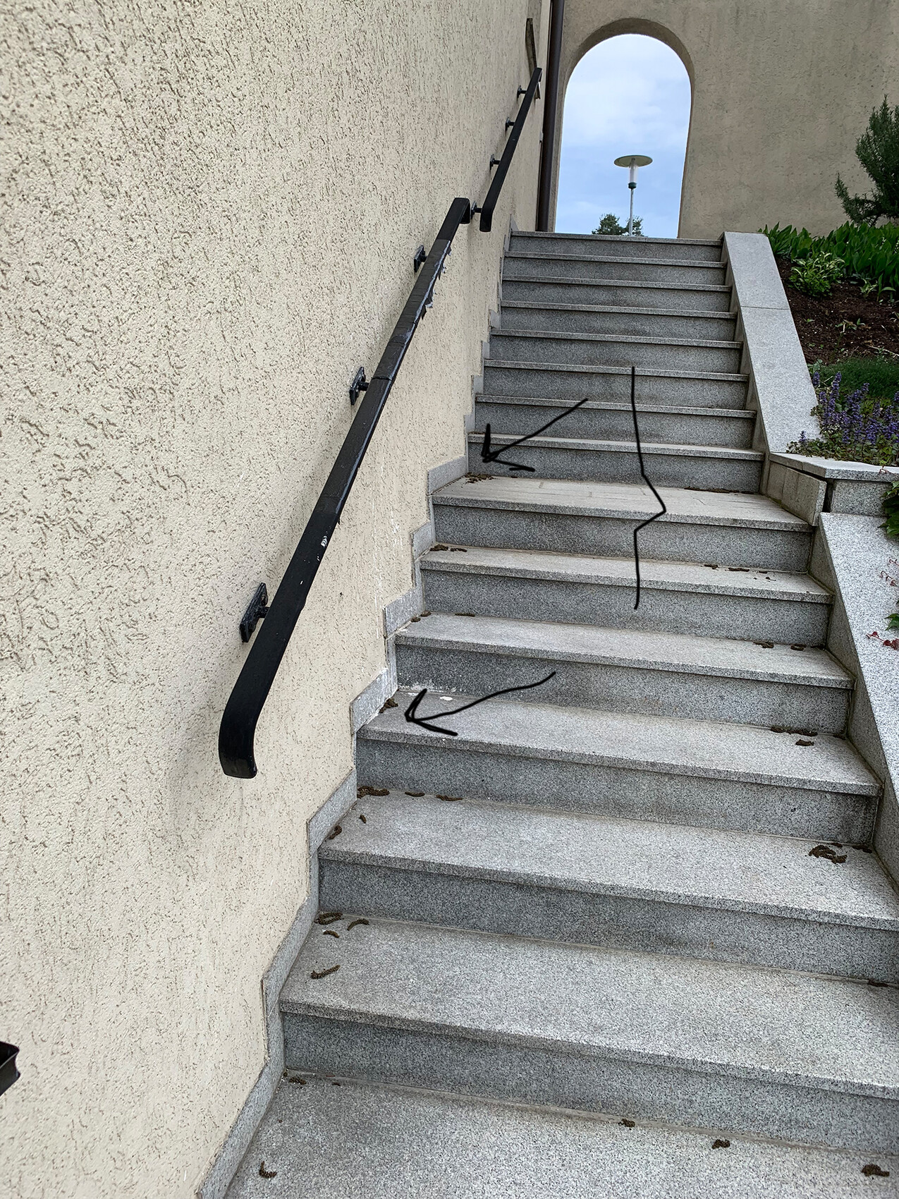 Problem 2) An dieser Außentreppe ist der Putz vom Mauerwerk "weggegangen" - ich vermute mal, aufgrund des montierten Geländers ist bei den Schrauben Wasser hinter den Putz gekommen und hat diesen somit vom Mauerwerk gelöst.