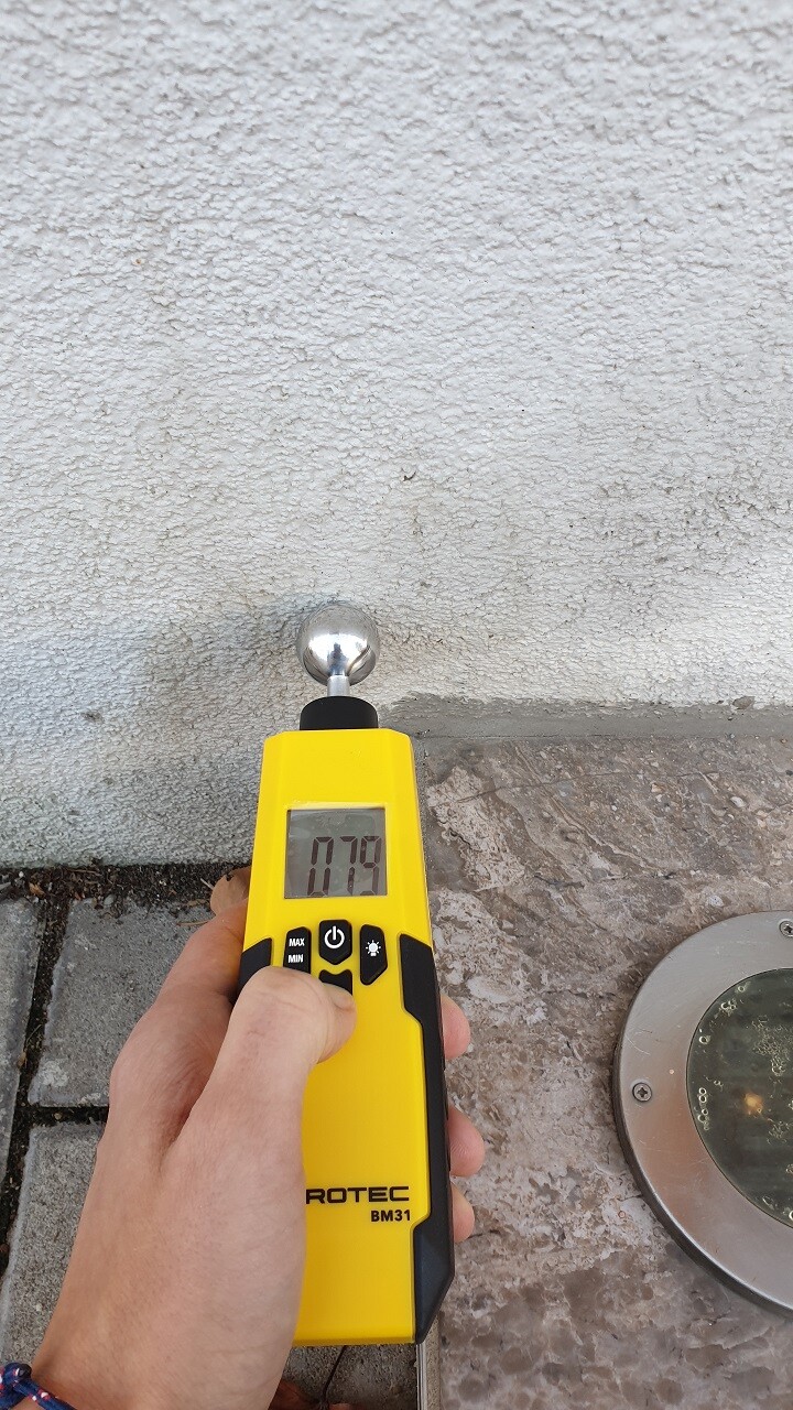 Beim Fühlen mit der Hand und durch das Klopfen habe ich ebenfalls subjektiv wahrgenommen keinen Unterschied gemerkt. Deswegen habe ich einen Feuchtemessgerät, Messprinzip: dielektrisch (5 - 40 mm) besorgt und gemessen. Der Außenputz scheint vollkommen intakt zu sein - keine Rissen oder ähnliches Ergebnisse sind wie folgt: