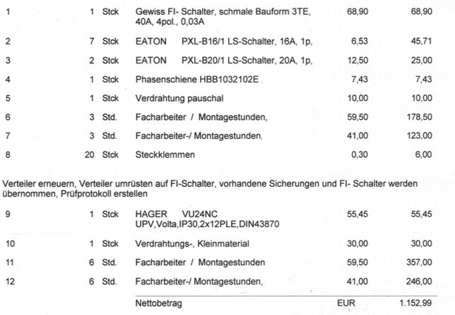 Elektriker-Rechnung mit Posten: Schalter, Verdrahtung, Montagezeiten, Nettobetrag.