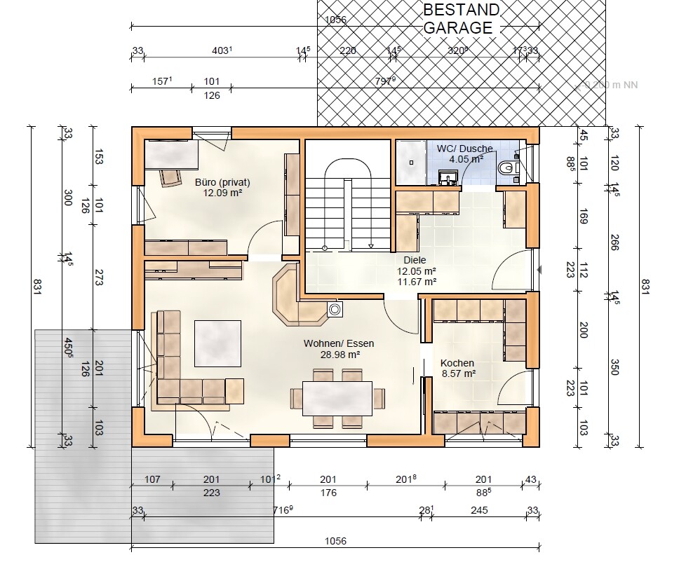 Den sog. Allraum bei weitgehend geschlossener Küche finde ich knapp bemessen, das WZ ist ein Durchgangszimmer.