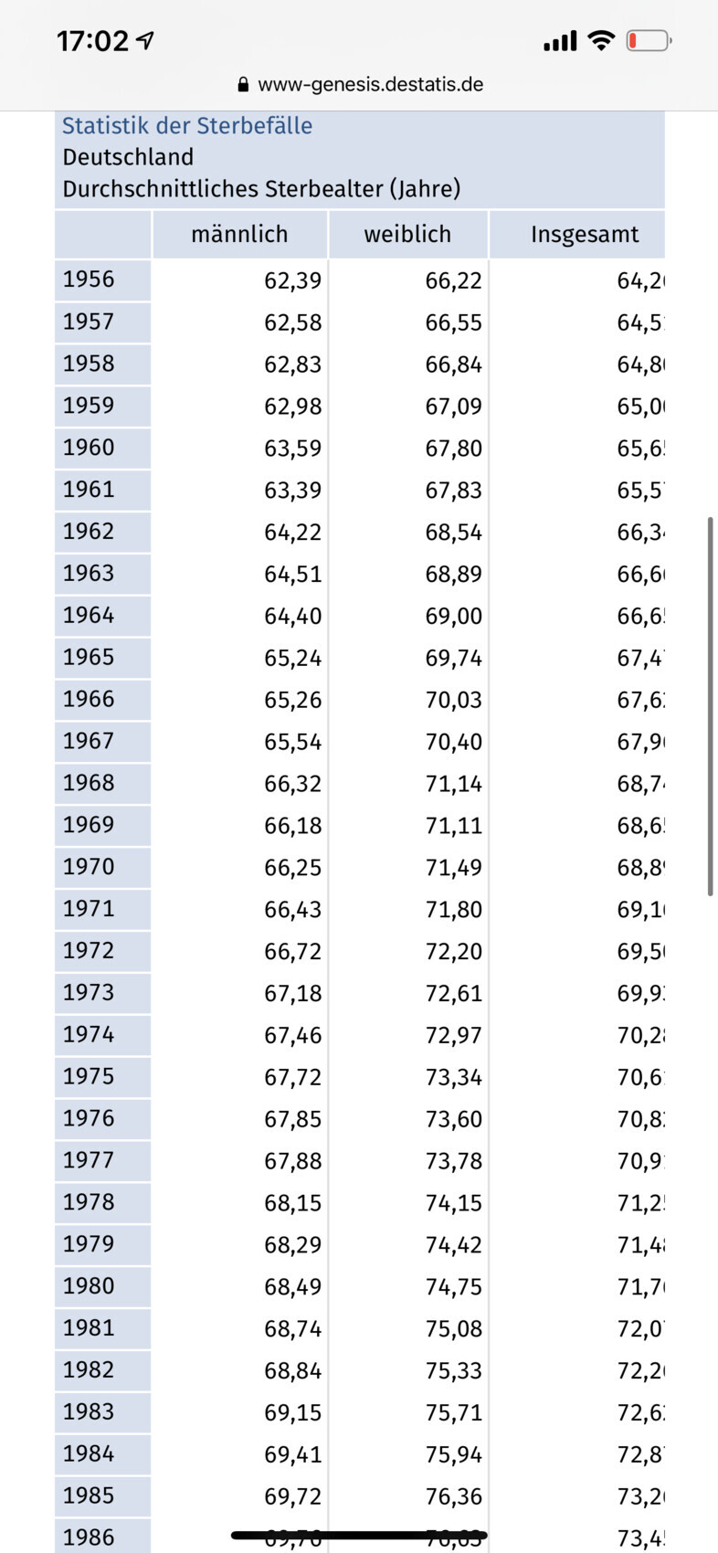Tabelle: Deutschland – durchschnittliches Sterbealter nach Geschlecht (m/w), 1956–1986.