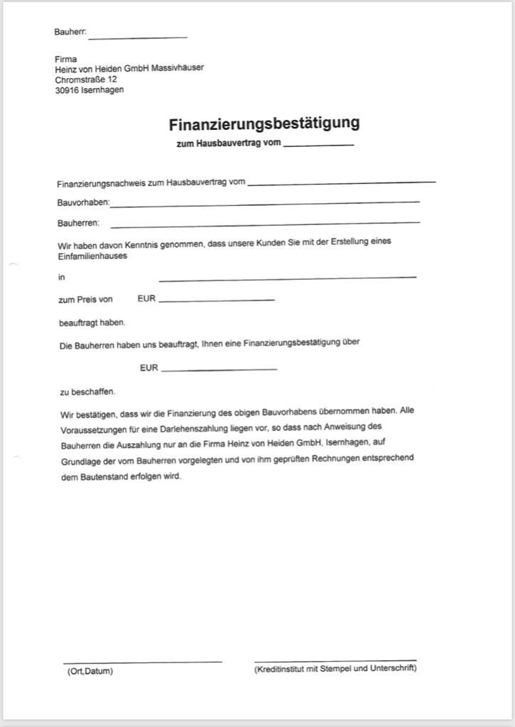 Heinz von Heiden fordert entweder eine Finanzierungsbestätigung oder eine Bürgschaft. Die Bank gibt aber *nur* eine Bürgschaft bei einem Heinz von Heiden Werkvertrag. Wer ist also der Böse? Sicher nicht Heinz von Heiden, wenn sie das oder das wollen. Ob sie das eine oder anderen dann auch akzeptieren, steht auf einem anderen Blatt.