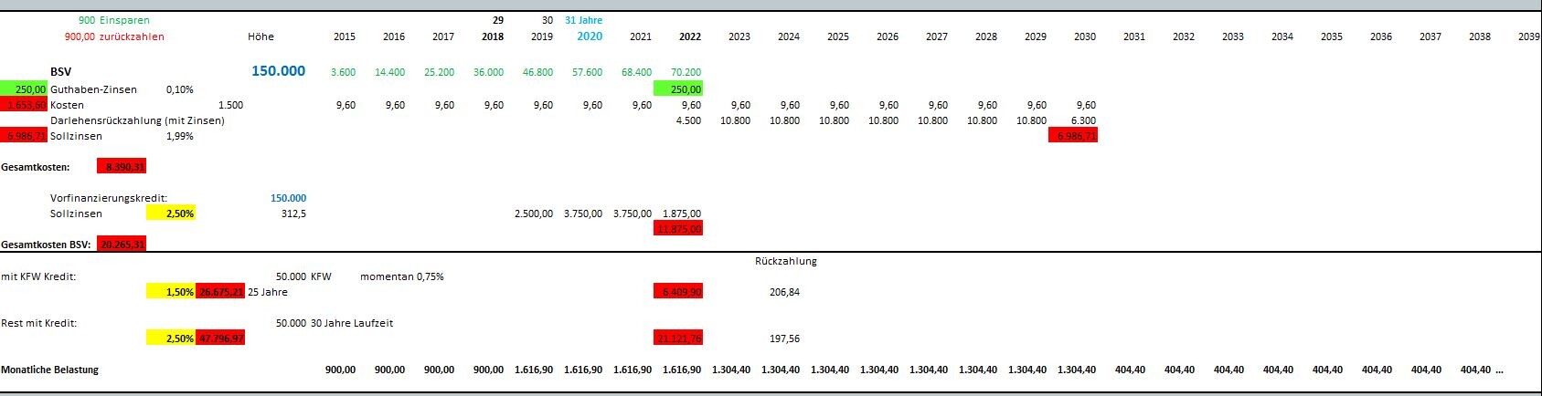 - ein Darlehens- und Vorfinanzierungskredit jeweils mit 2,5 % (mit vielen anderen Werten ebenfalls gerechnet, der Übersicht halber sind diese ausgeblendet)