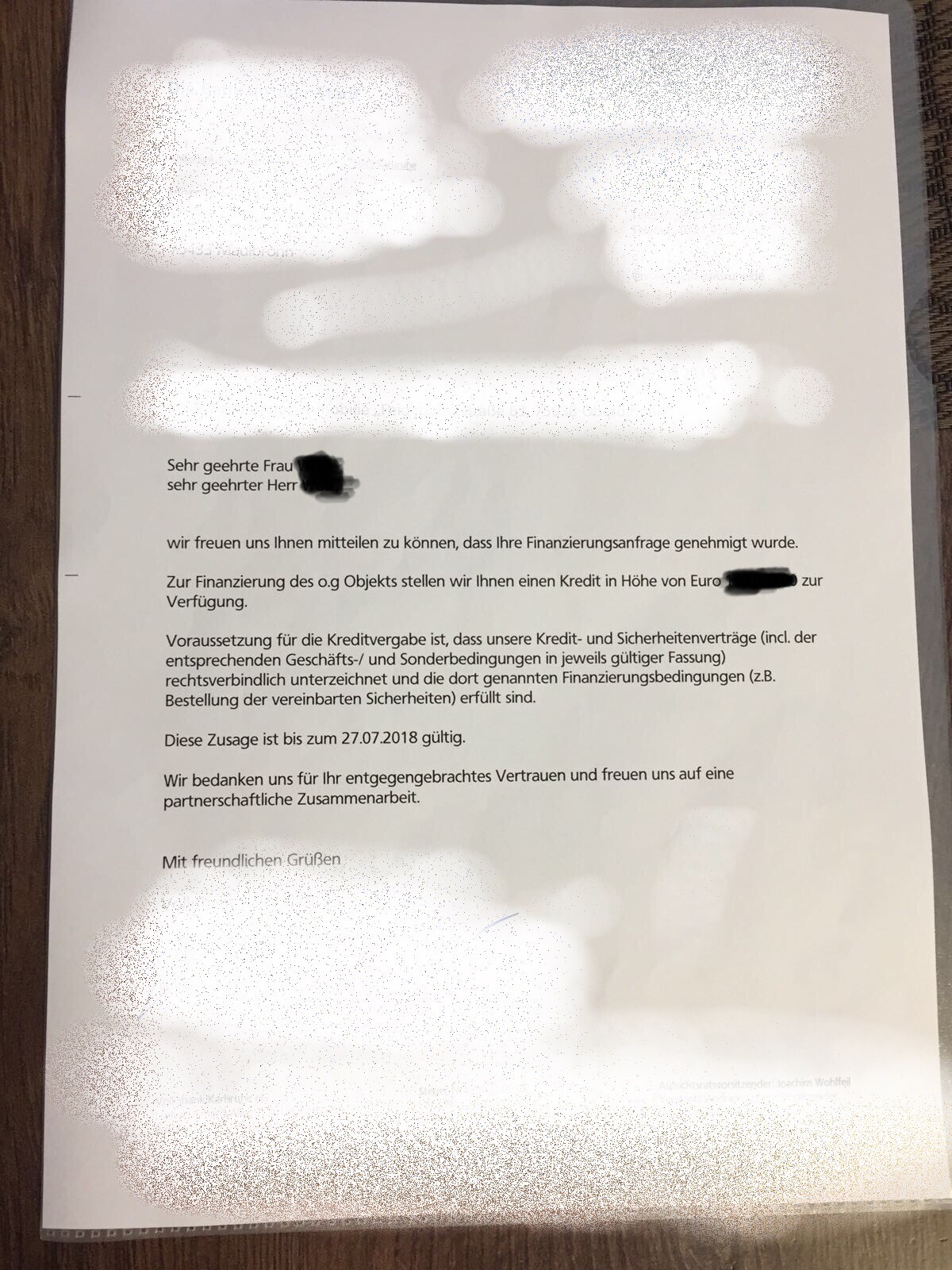 Ich will eine Eigentumswohnung kaufen und will das über die Volksbank finanzieren. Angebot erhalten, dann eine unverbindliche zusage bekommen. Die nächste 3 Wochen wollen sie immer wieder Unterlagen. Jetzt seit letzter Freitag (6.07.2018) ist alles eingereicht und ich habe vor kurzem eine “verbindliche finanzierungszusage” .