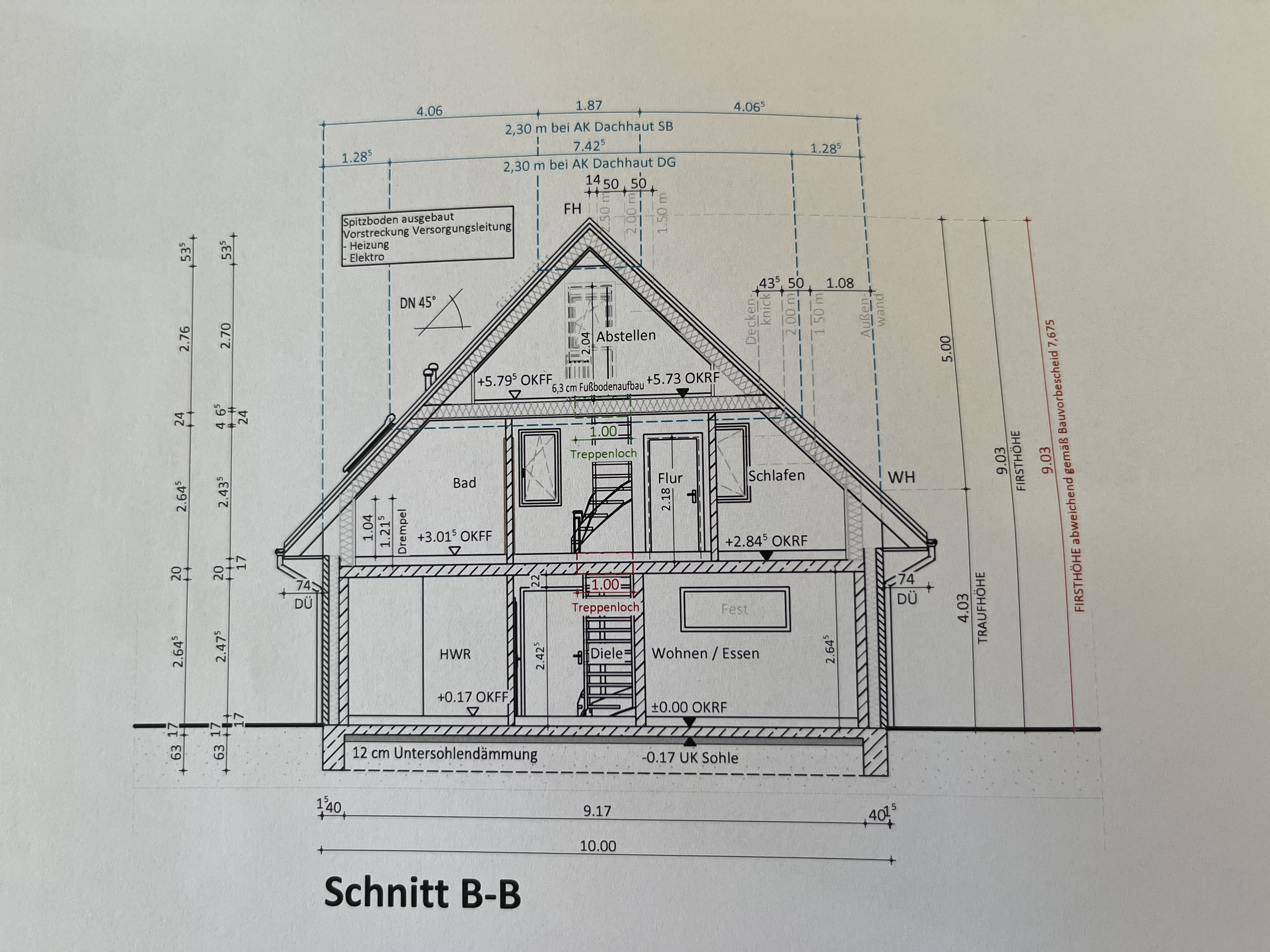 Ich habe nun noch einmal in die Pläne geschaut. Neben der Südausrichtung kommt noch dazu, dass wir bei gedrehtem Dach weniger Stehhöhe im Spitzboden hätten. Eine Gaube ist tatsächlich durch die 2/3-Regelung in Schleswig-Holstein nicht möglich.