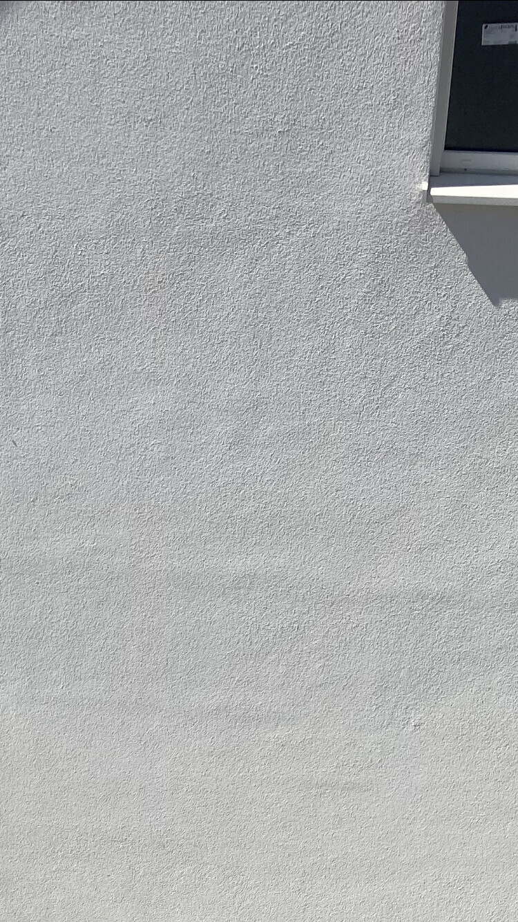 Grau texturierte Außenwand mit kleinem dunklem Fenster oben rechts.