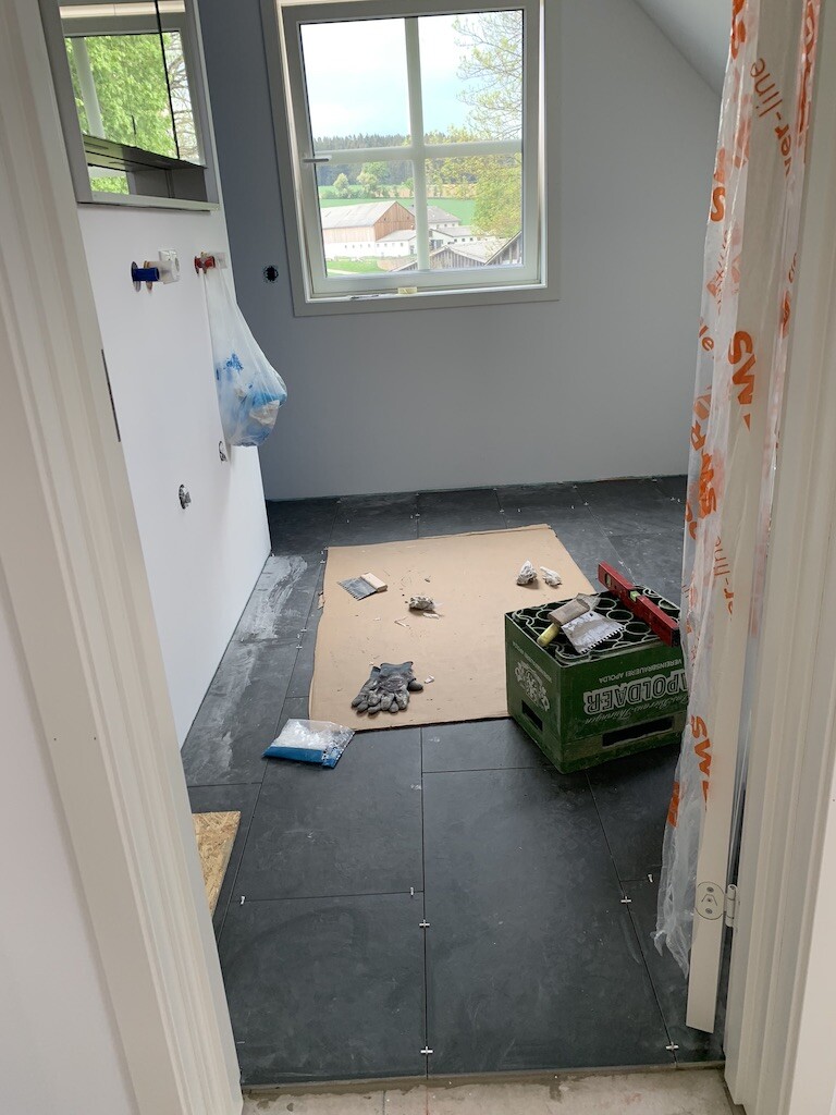 Die Dusche besteht also aus 2 nicht deckenhohen Innenwänden und der hohen Außenwand. Wir würden die Außenwand nur so hoch Fliesen wie das T ist, dass die Fliesen in der Dusche alle gleich hoch sind. Das restliche Stück über den Fliesen würden wir verputzen. Der Fliesenleger meint er würde die hohe Wand bis zur Decke fliesen.