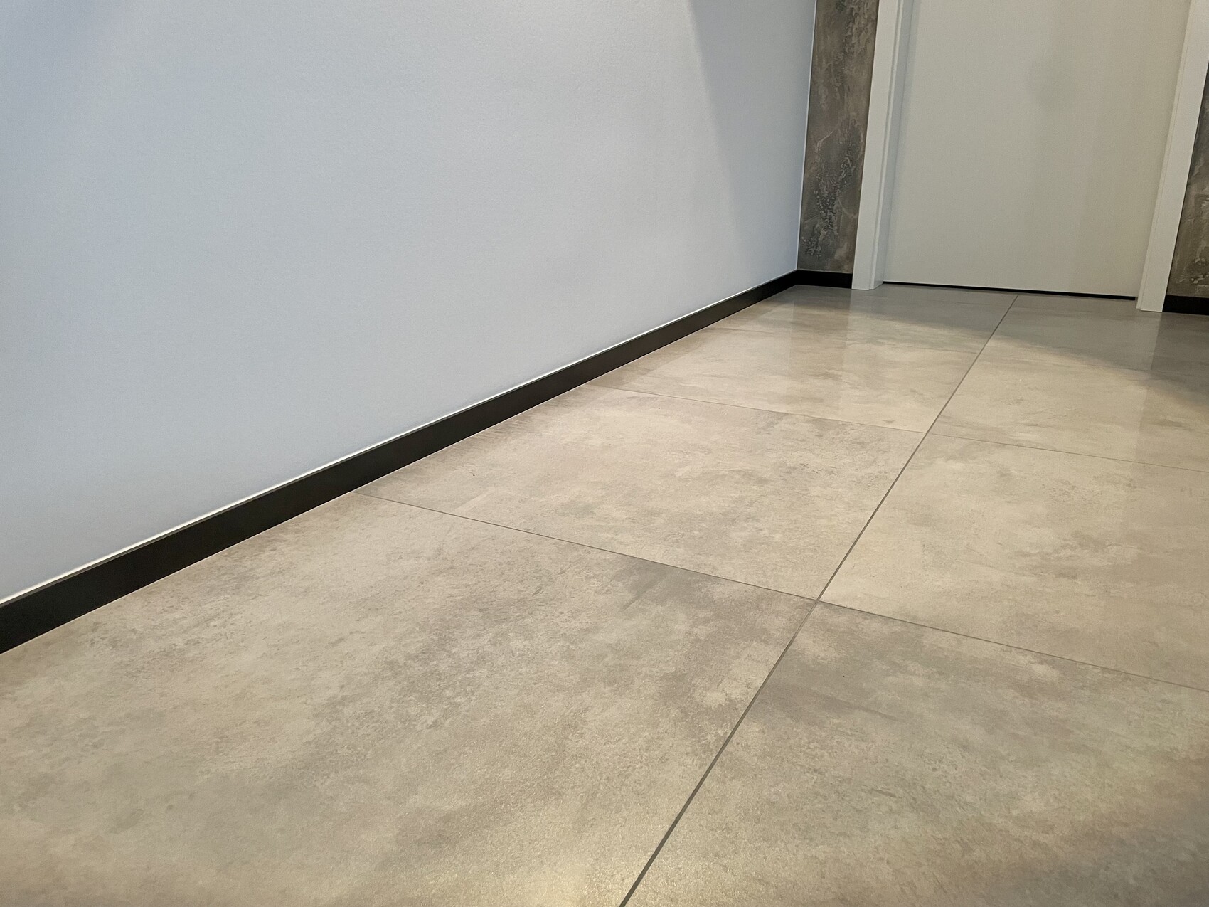Flur mit großen hellgrauen Fliesen, hellblaue Wand, dunkle Sockelleiste, Tür am Ende.