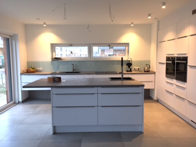 Man sollte nur kein Milchglas nehmen, weil dahinter etwaiger Dreck durchschimmert, sondern rückseitig lackiertes Glas. Bei uns ist es hinten weiß lackiert; es schimmert aber durch das grau der Arbeitsplatte auch immer gräulich.