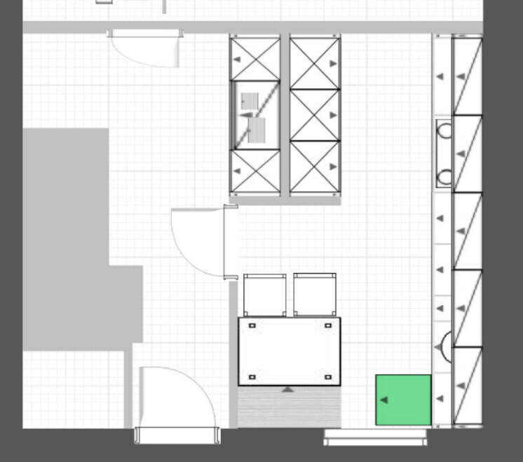 Grundriss eines Raums: zentraler Tisch mit zwei Stühlen, Regale an der Wand, Türen, grüne Ecke.