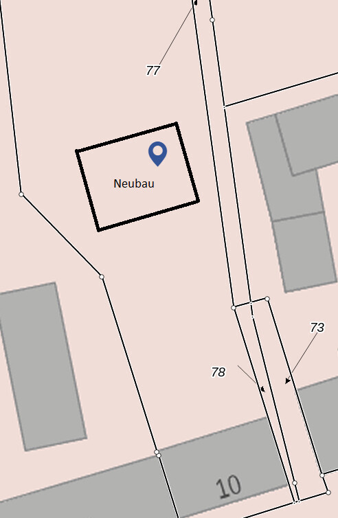 Kartenansicht mit neuem Gebaeude (Neubau) im schwarzen Rahmen und blauem Pin.