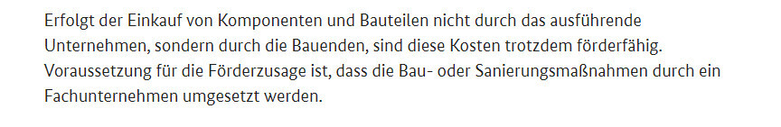 Text auf weißem Hintergrund: Bauteil-Einkauf ist förderfähig, auch bei Bauarbeiten durch Fachunternehmen.