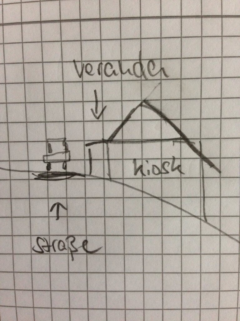Am Kiosk(Straßenseite) ist ein Vordach also eine Art überdachte Veranda(nachträglich 1981) angebaut worden . Die geht über den ganzen vorderbereich des Kiosk und ist 1,25 m breit(oder tief?)