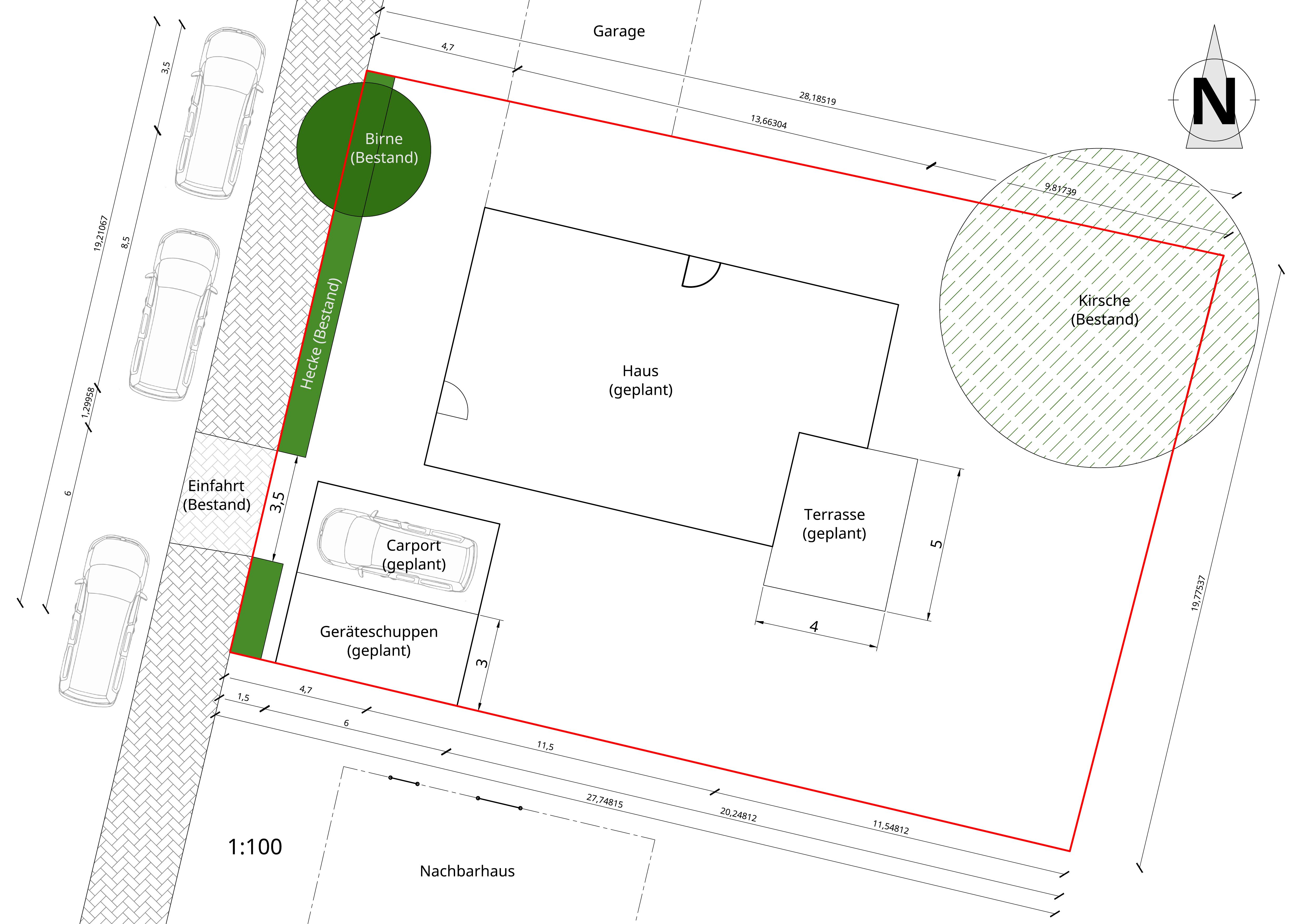 - Grundstück: wie kann es optimal genutzt werden, wo wäre ein zweiter Stellplatz möglich für Gäste, ohne die Südseite mit einer großen Garage zuzumauern oder der Küche das Licht zu nehmen? Unser Gedanke: zweite Einfahrt an der Nordwand entlang beantragen, aber 3,5m sind recht knapp für Stellplatz und Hauseingang. Wichtig ist zudem, dass ein mindestens 15 m² großer Schuppen / Abstellraum für Gartengeräte, Autoreifen, Fahrräder im vorderern Bereich erhalten bleibt.