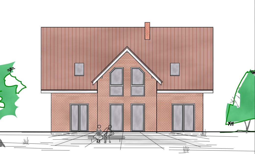 · Dachform: Satteldach, 45° Neigung, Drempel 1m, Kapitänsgiebel an der Terrassenseite, rote Dachziegeln engobiert