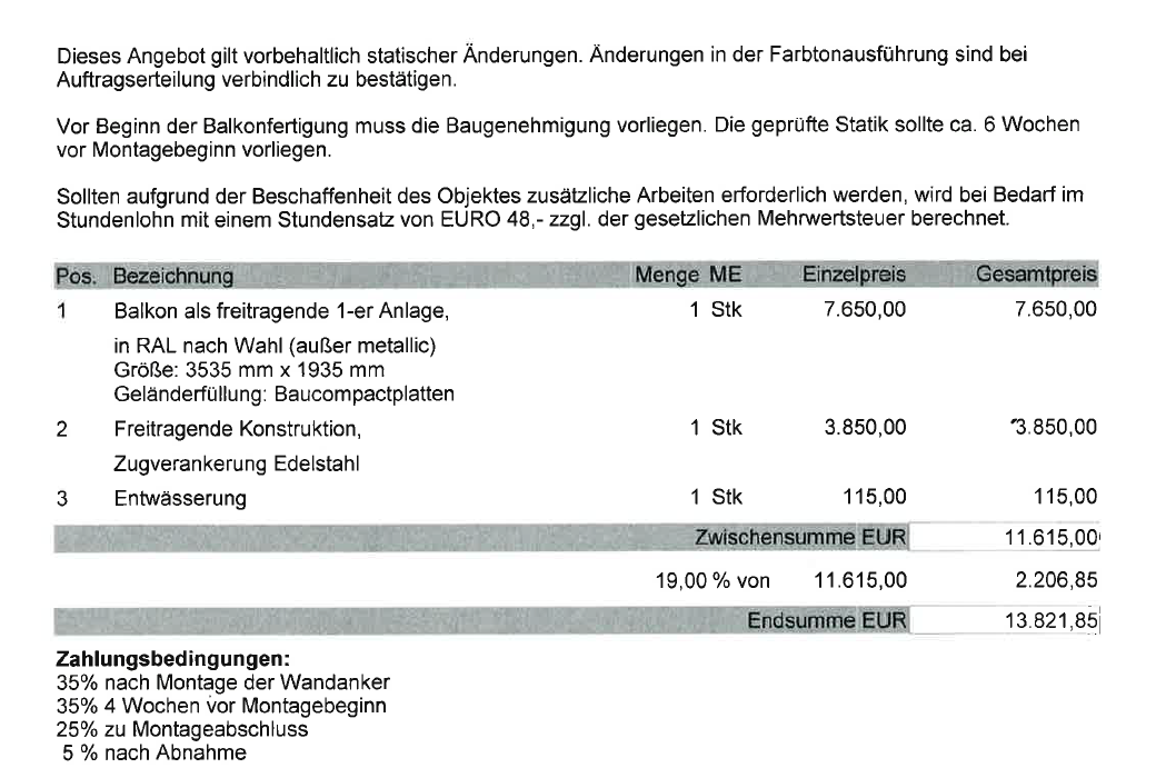 Ein schriftliches Angebot habe ich inzwischen Erhalten.