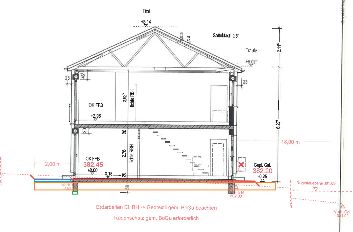 - Aktuelles Gelände ist Hausecke 1: 382,0m Hausecke 2: 382,0m Hausecke 3: 382,1m und Hausecke 4: 382,6m