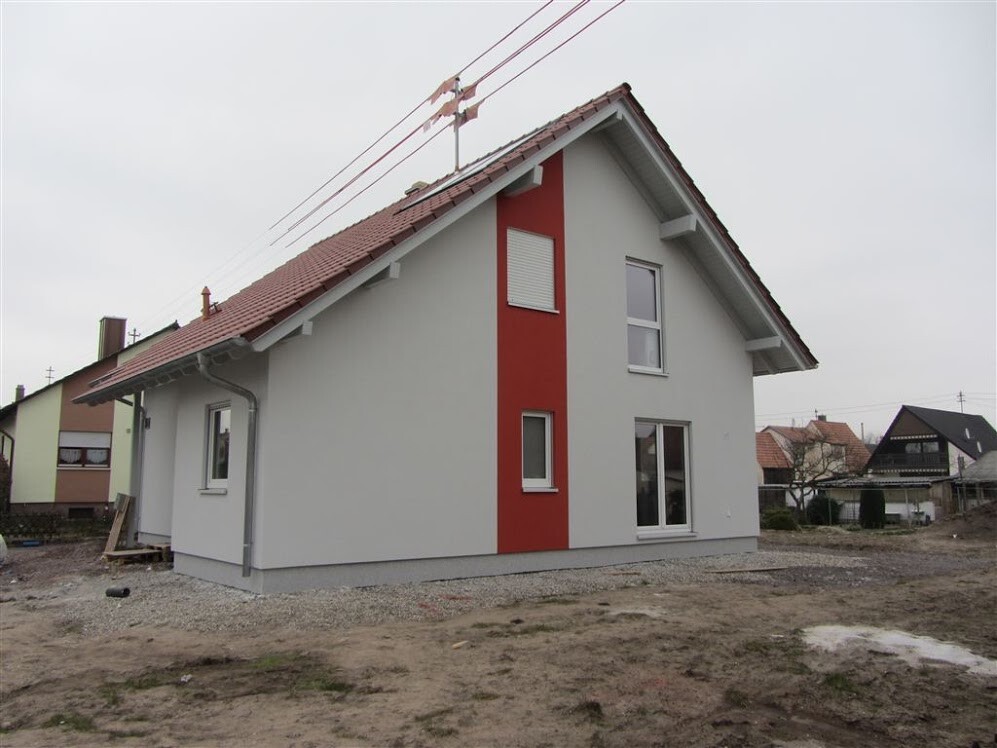 Wir haben uns für ein weißes Haus mit anthrazitfarbenen Fenstern und dunkelroten Dachziegeln entschieden.