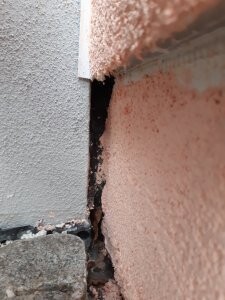 Nahaufnahme einer Rissbildung in der Wand an der Fugenstelle zwischen Bauteilen, bröckelnder Putz sichtbar.