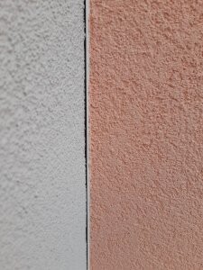 Nahaufnahme zweifarbig gestrichene Außenwand mit vertikaler Fuge, grau links, pfirsich rechts