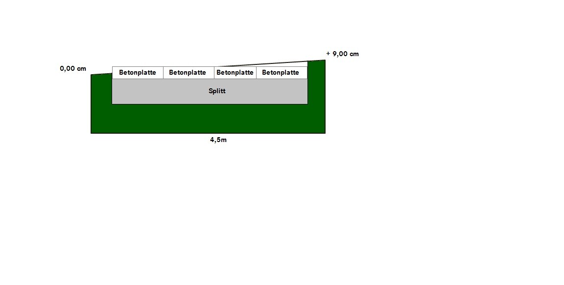 ich bin gerade dabei für unser gerätehaus mit Seitendach ein Fundament aus Betonplatten zu erstellen. Nun bin ich auf das Problem gestoßen, das ich bei den Außenkanten (Rasen) der "Baugrube" des Gerätehauses ein Gefälle von 2% habe (9 cm auf 4,5m). Ich hoffe Ihr könnt mir Tipps geben, wie ich das Fundament höhentechnisch am besten ausführe.