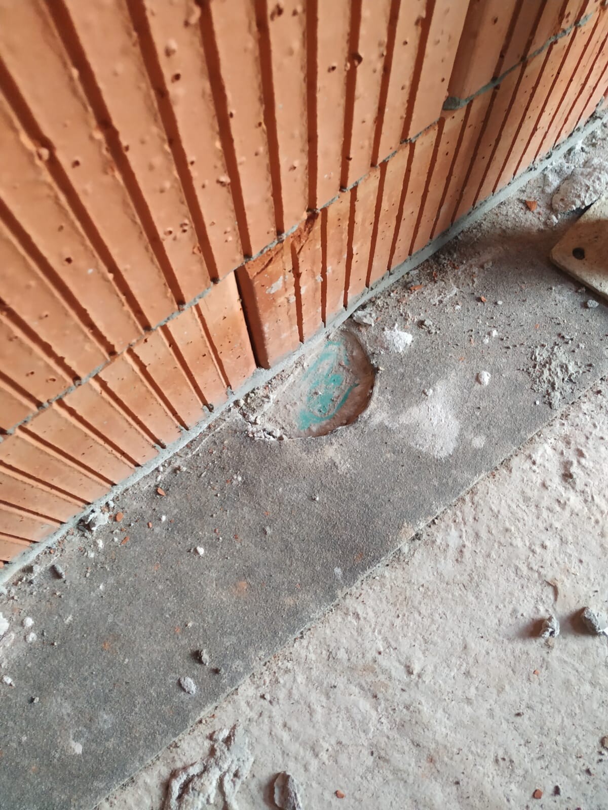 Baustellenecke mit roter Ziegelwand, Betonboden und grünem runden Abflussdeckel.