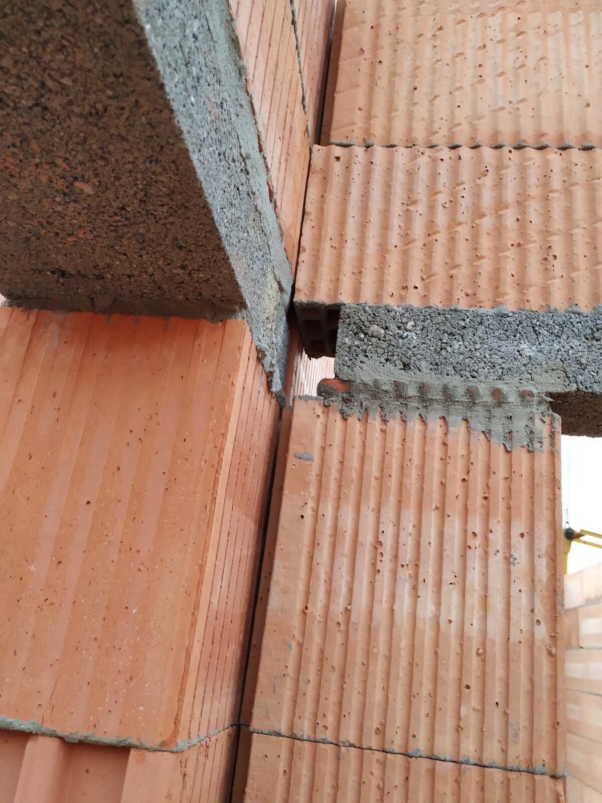 Unvollständige Mauer aus orangefarbenen Ziegeln mit grauem Mörtel; Eckverbindung sichtbar.