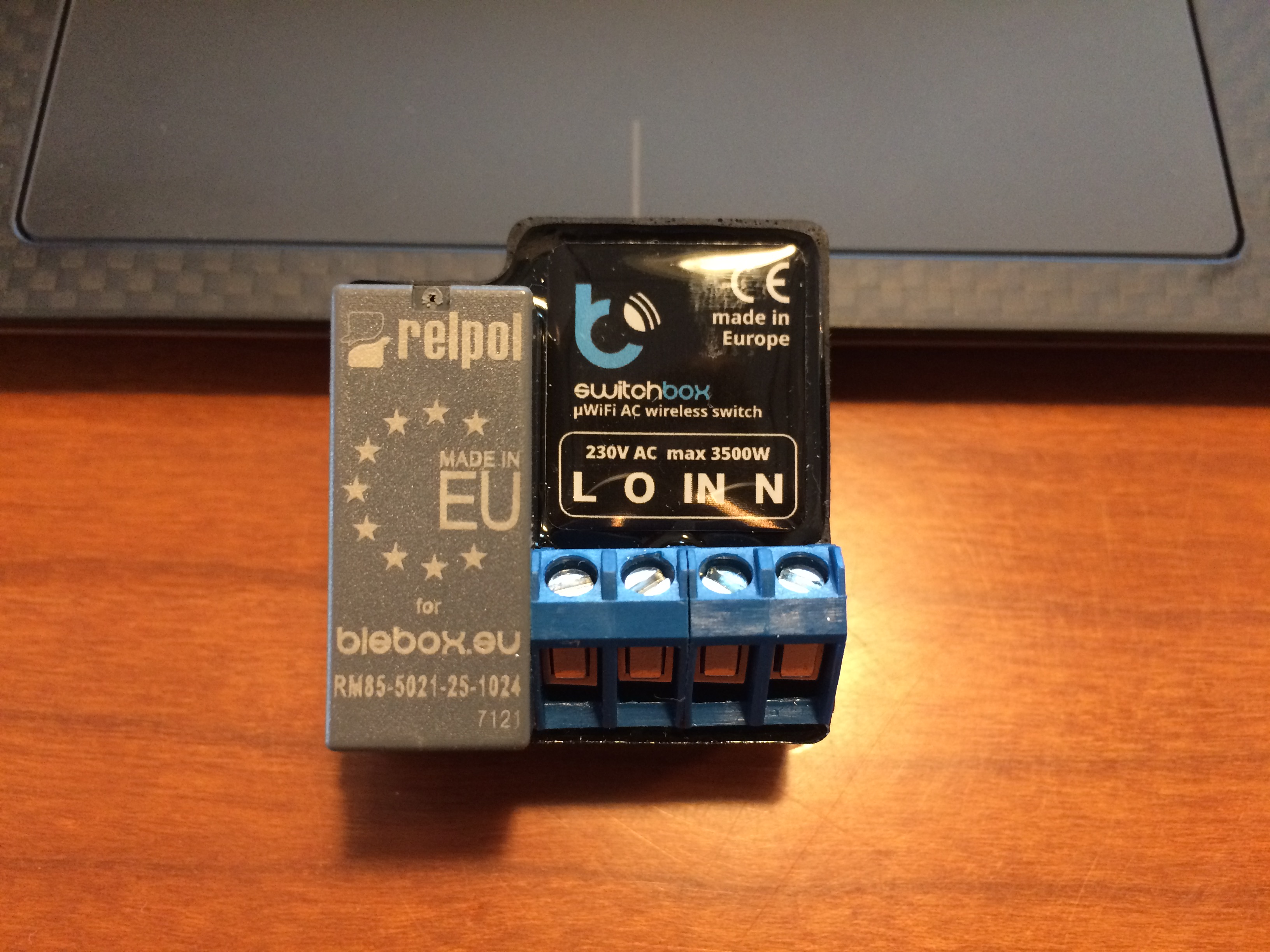 Relpol-Relaismodul und Switchbox-WiFi-Schalter mit blauem Terminalblock auf Holztisch.