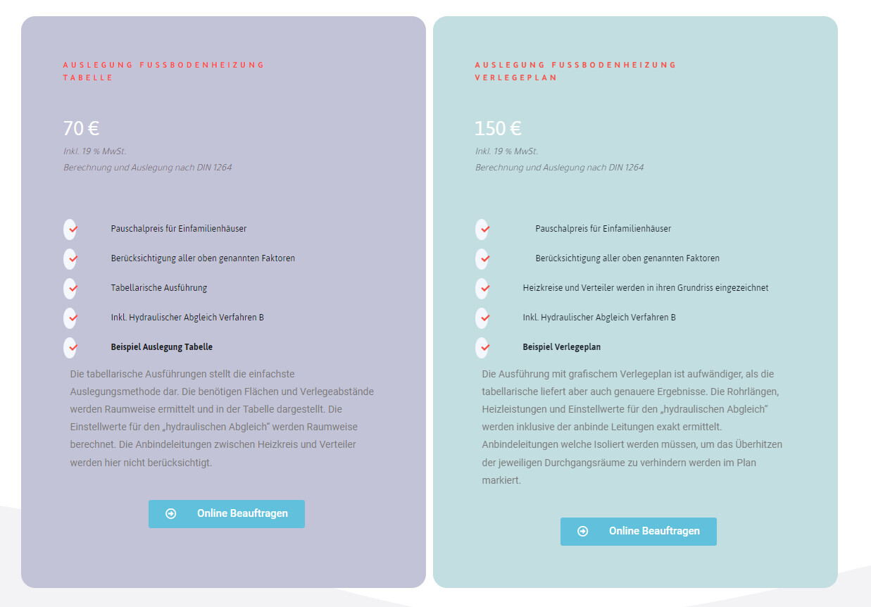 Zwei Preispläne für Fußbodenheizung: links 70 €, rechts 150 €, Checklisten, Online-Beauftragen.