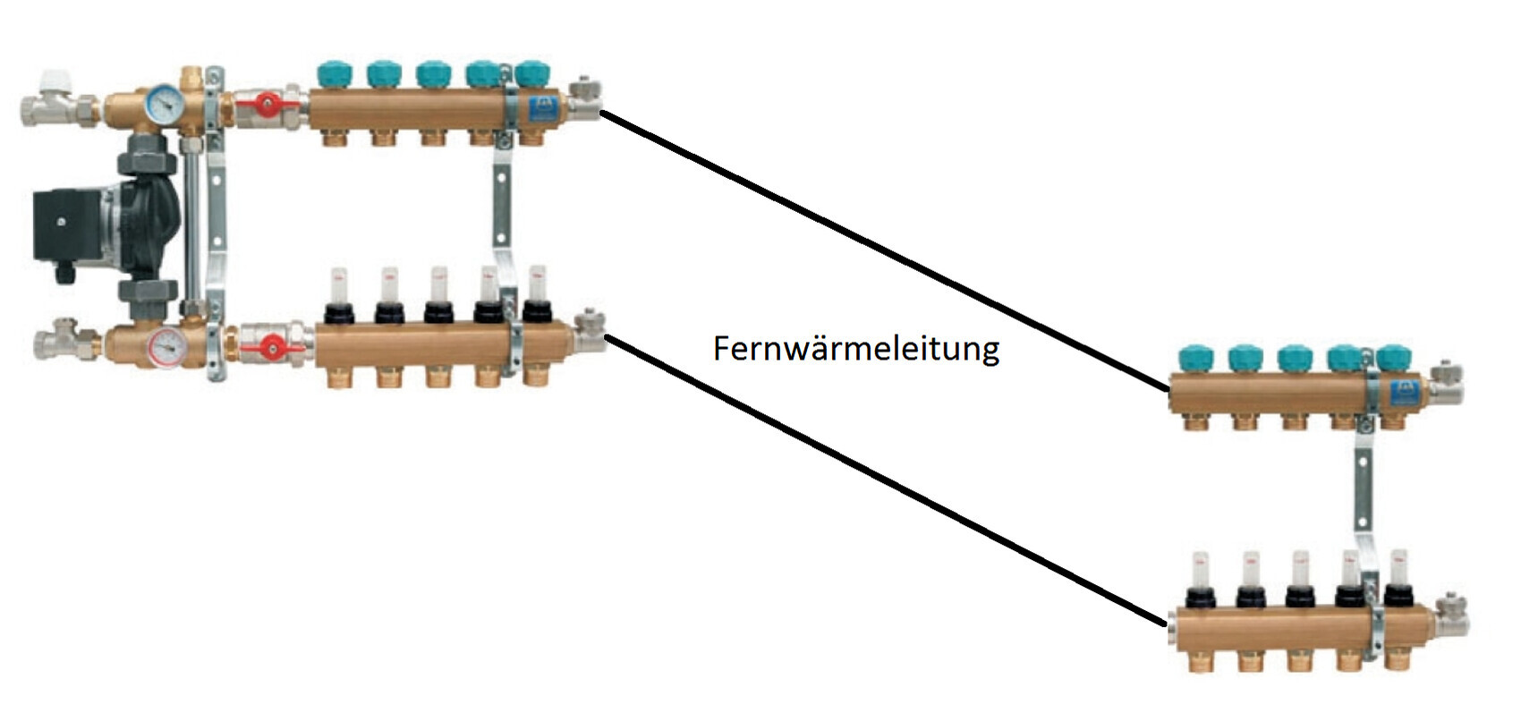 Dann müsste ich zwecks Leitungslänge und schon vorhandener Fernwärmeleitung 2x20 dort noch einen extra Verteiler haben mit Mischer oder sehe ich das Falsch?