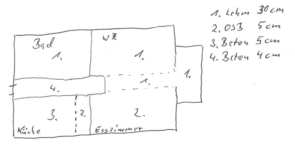 4. Küche und Esszimmer: Hier weiß ich noch nicht wirklich wie ich das machen soll. Ich tendiere aber in Richtung Trockenschüttung zum Ausgleich dann OSB schwimmend und danach das Fertigparkett.