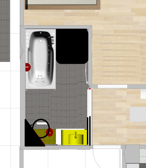 Mit Schiebetür ins Bad (sofern das keine tragende Wand ist), WC, Wanne und dusche. Das Waschbecken kann man noch über Ecke rücken, dann verbleibt mehr Abstand zum WC. Anstatt Wanne und Dusche würde auch eine große Eckwanne funktionierenWem so was gefällt,der Raum wird nicht größer und es ist alle eng und gedrückt. Einfach auf die Wanne verzichten und großen freundlichen Duschbereich gestalten. Mal sich fragen wie oft man in den letzten drei Monaten die Wanne genutzt hat dann mal fragen ob sie wirklich benötigt wird. Nur weil man es irgendwie auch über Eck quetschen kann heißt es ja nicht das es auch schön und sinnvoll ist.Bei 5m2 muss man halt abstriche machen.