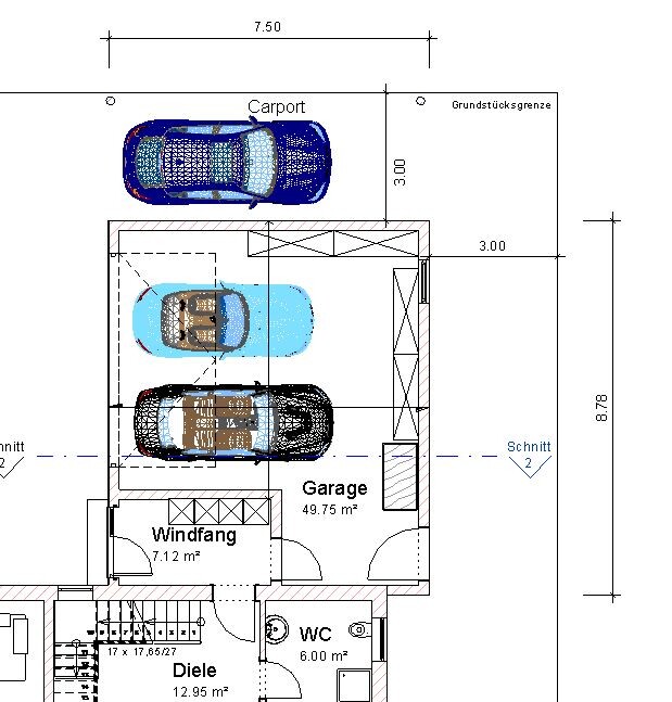 Ist ein Carport unabhängig von einer Garage? Wir haben uns das nun so gedacht: Wir bauen die Garage von der Grenze weg, dann können wir den Windfang so bauen wie wir möchten (und könnten später sogar die Garage ausbauen). Da dann aber keine 3 Fahrzeuge in die Garage passen wollten wir gleich einen Carport bauen, indem wir das Dach der Garage verlängern:
