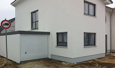 Hier mal so ein Beispiel woran ich das Fest mache. Und da sieht man auf dem Bild ja nicht mal die Details, wie Putzstruktur und Farbe. Dünne Wände oder Seitenteile der Garage passen null zum Haus, Der Haussockel hört bei der Garage auf. Sieht einfach nur drangeklatscht aus. Die Riesen Fuge, die zugeschmiert ist, sieht man sogar auf dem Schlechten Bild, weil sie in Weiß strahlt.