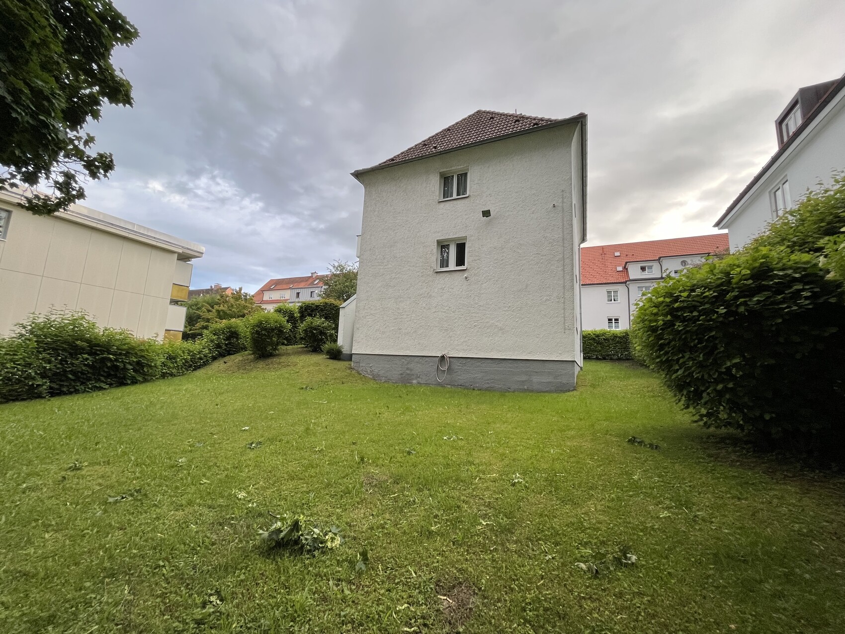 Hinter dem Haus ragt die Bodenplatte 1,10 m über den Rasen/Boden.