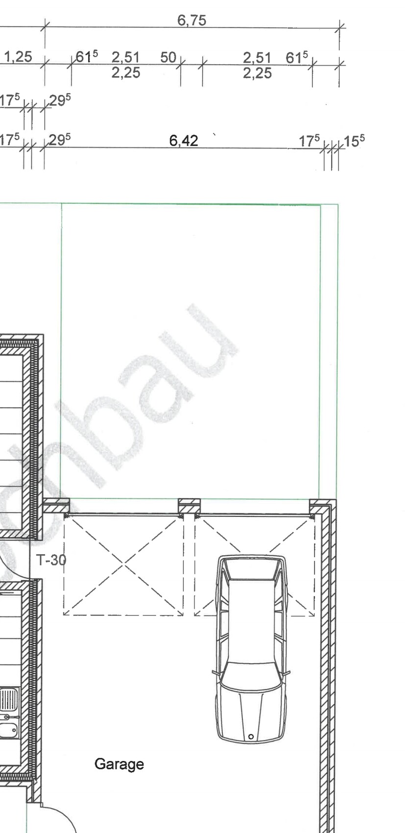 Zunächst wurde unsere Garage wie auf dem Bild mit 2 Toren geplant. Während der weiteren Planungsphase haben wir uns dann allerdings doch für ein großes Tor entschieden. Dies hatte für uns zum einen einen optischen Aspekt und zum anderen haben wir überlegt, dass wenn mal Reparaturen am Auto oder ähnliches durchgeführt werden müssen oder man ein anderes großes Fahrzeug mal unterstellen muss, mittig in die Garage fahren kann und keinen störenden Pfosten in der Mitte hat.