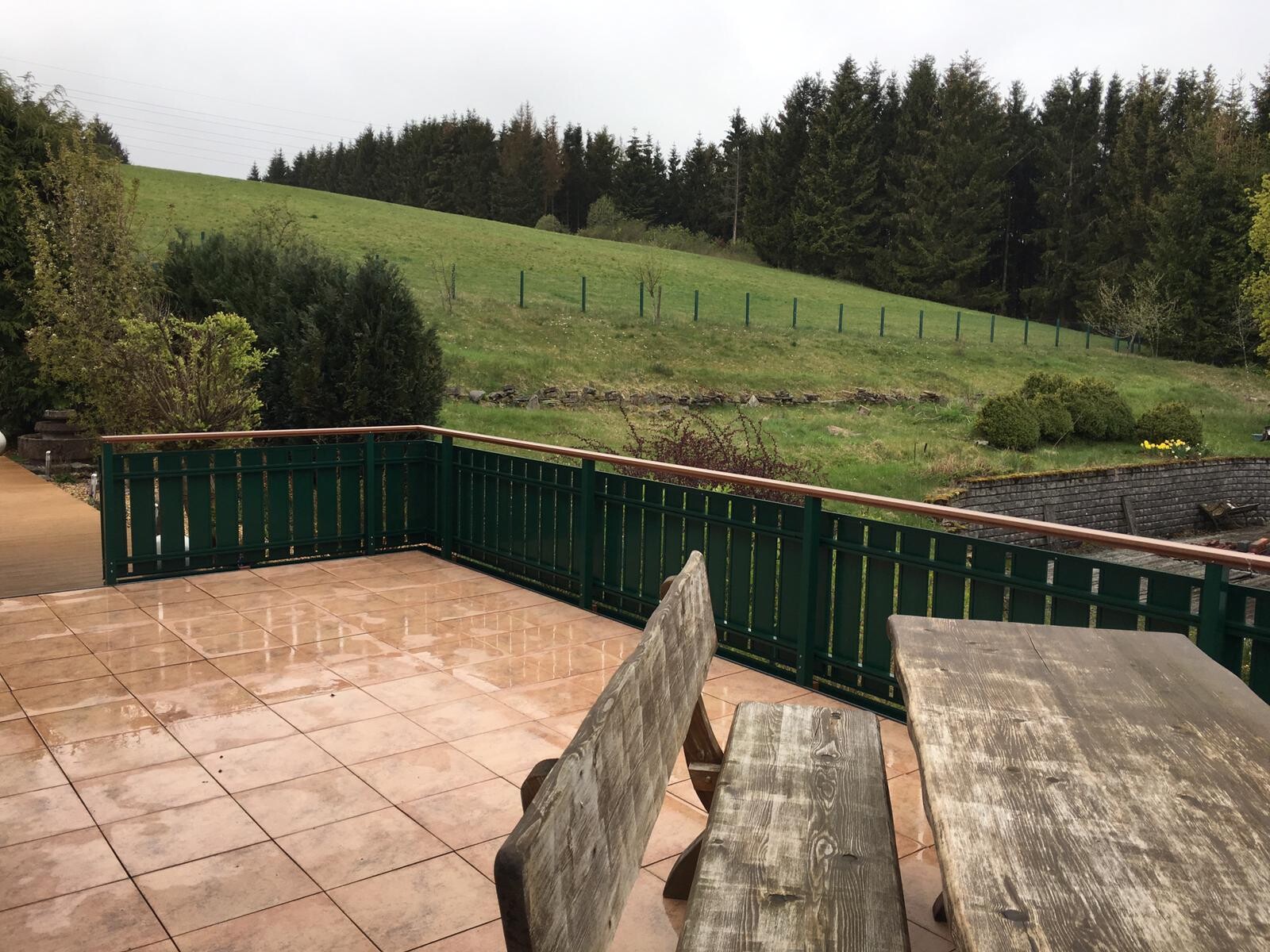 Terrasse mit beigen Fliesen, grünem Geländer und Holztisch; Wiese und Wald dahinter.