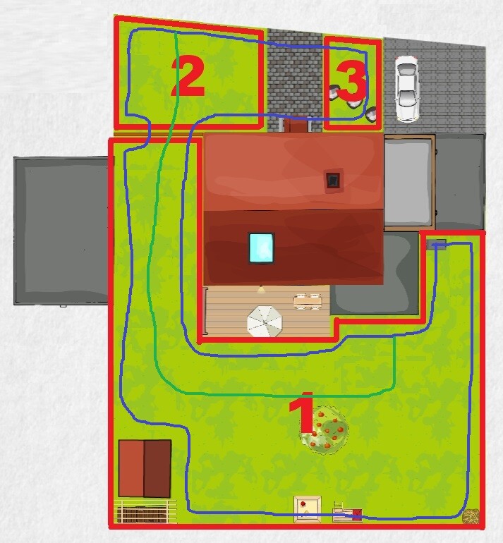 Habe nun mit der Detailplanung begonnen. Anbei findet Ihr Bilder unseres Garten samt meinen Überlegungen zur Verlegung des Begrenzungskabel.