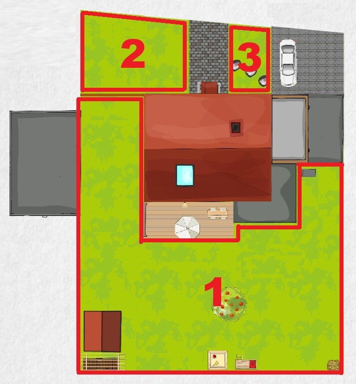 Gartenplan (1. Hauptgarten; 2. Mähfläche getrennt durch Gartentor, welches nach Bedarf geöffnet wird; 3. Abgetrennte Gartenfläche)