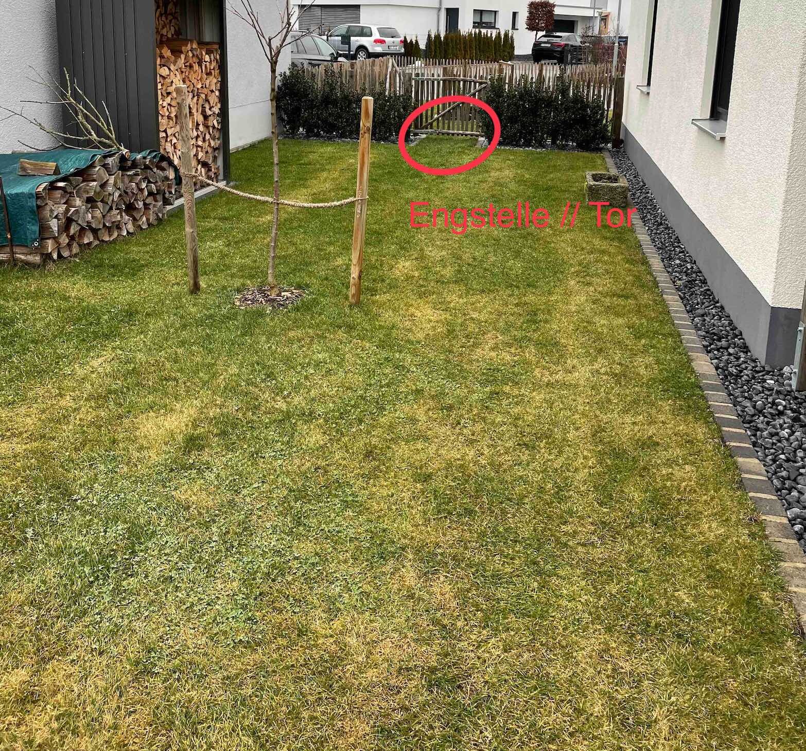 5. Engstelle (1,00 m) - Tor würde ich nach Bedarf (z.B. 1-2 x in der Woche offen stehen lassen, damit der Roboter den vorderen Bereich mäht).