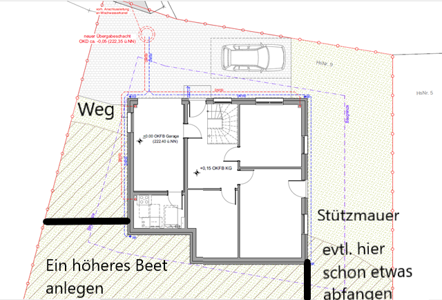 Verstehe ich dich richtig, dann du im Terrassenbereich (dein schwarzer Bereich) schon ordentlich Erde auffüllen würdest, um dann ggf. einigermaßen ebenerdig rauszugehen? Und dann in Richtung meiner Eltern ggf einen Absatz einplanst?