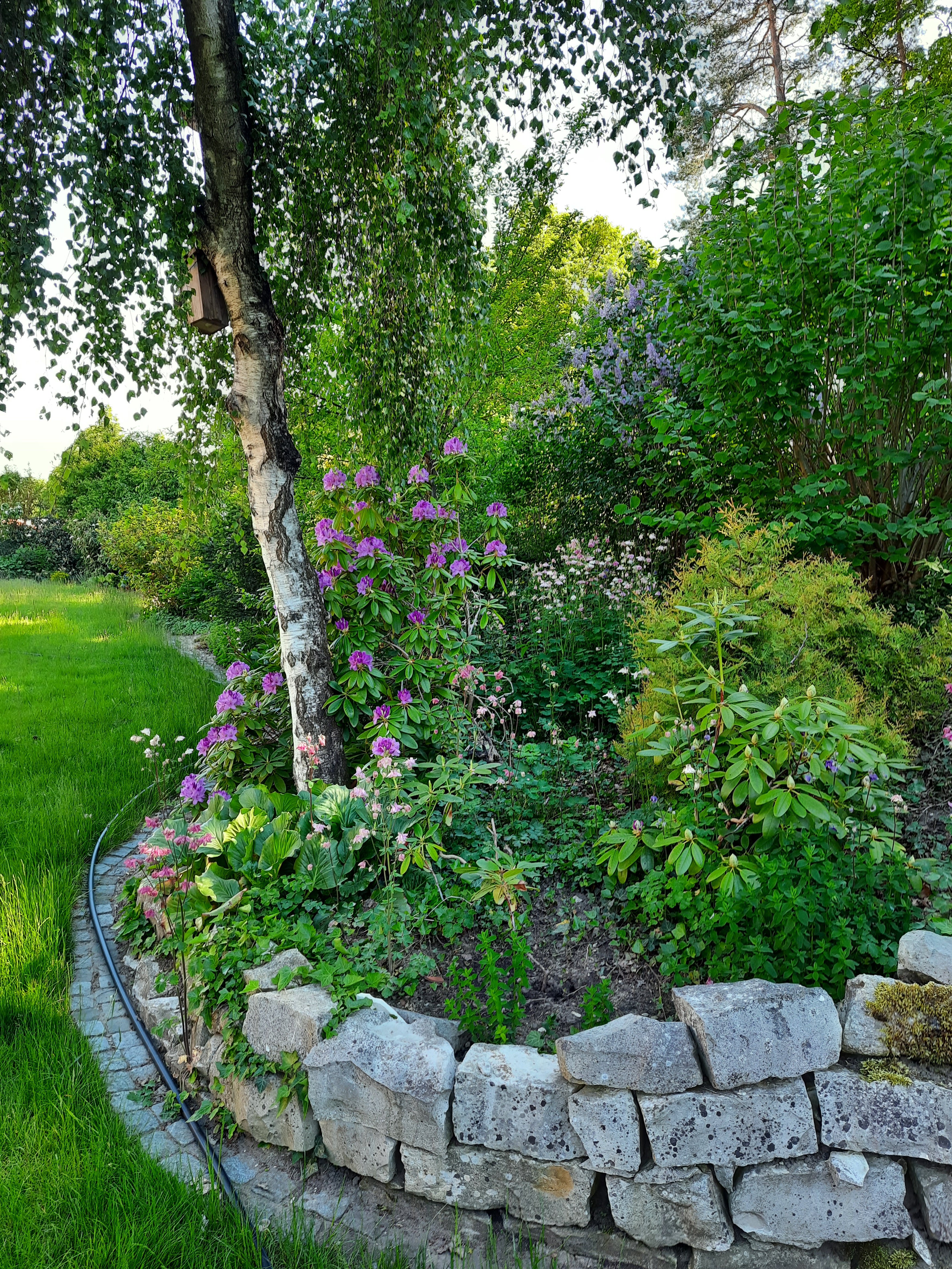 Vielleicht zum Beet hin ein bisschen höher - falls das nicht zu viele Steine verbraucht - aber halt zum Rasen hin auf jeden Fall mit Mähkante.
