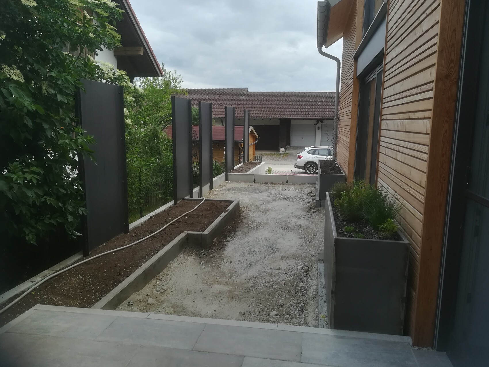 Auch die Sichtschutzwand ist endlich fertig und wir konnten das Beet dort auch bepflanzen: