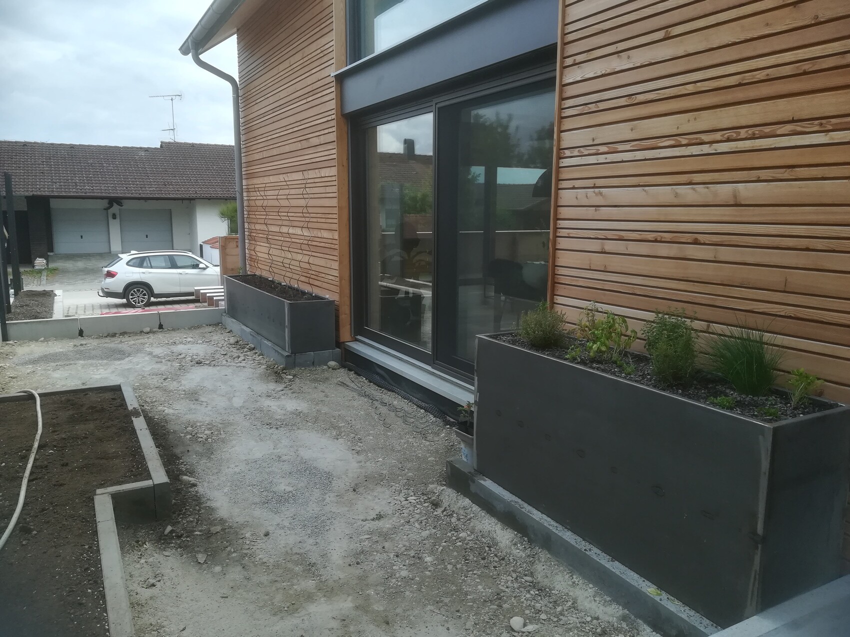 Jetzt fehlt noch die Holzterrasse, die dann in den bereits bestehenden Balkon übergehen wird und die Treppe von dieser Terrasse runter in den Vorgarten. Und die Beleuchtung muß auch noch gemacht werden (deswegen liegen da jetzt noch überall die Kabel rum). Ein paar Spots in den Beeten und noch ein paar Außensteckdosen sind geplant.