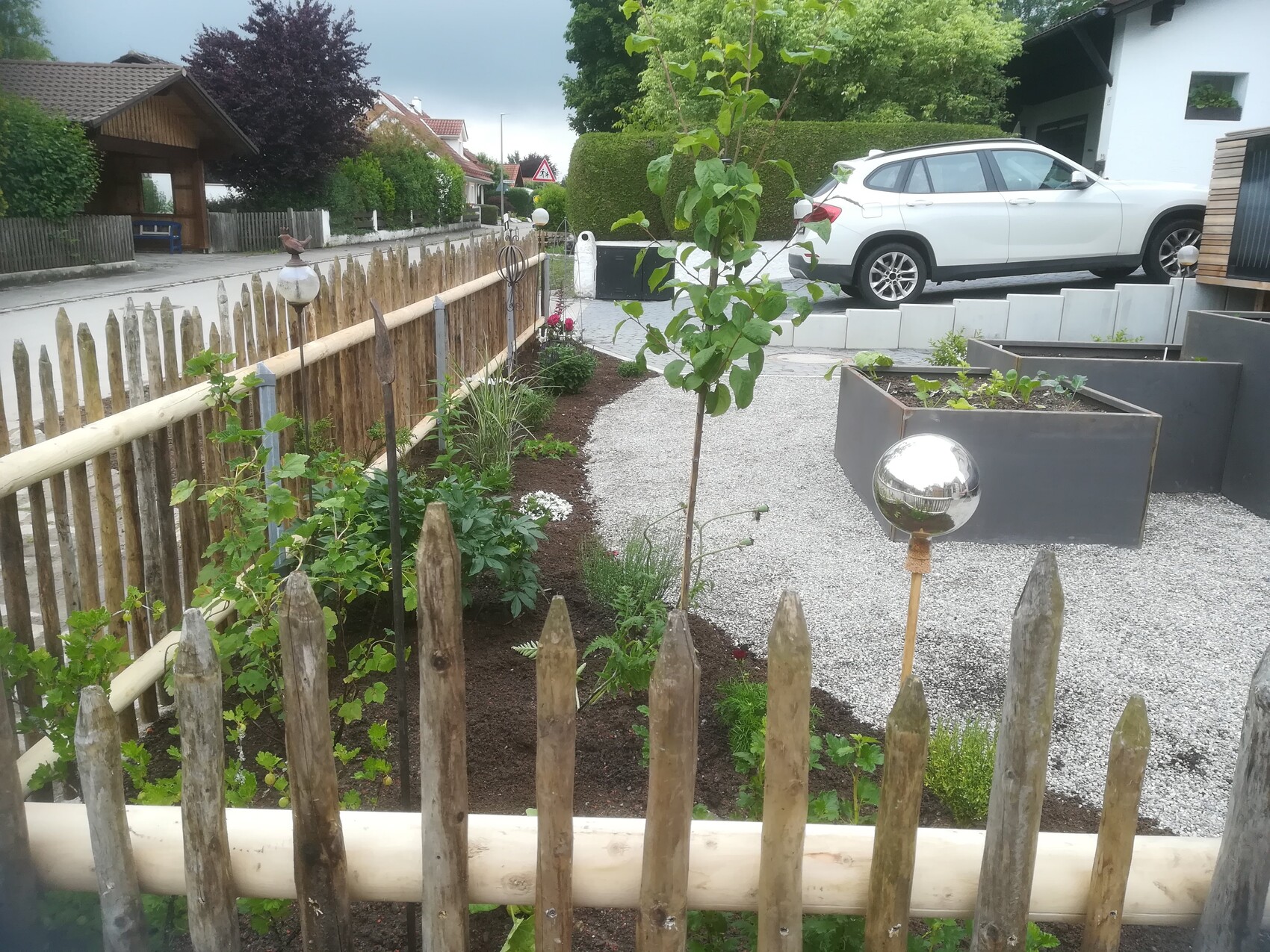 Am Montag kamen dann auch die Holzteile des Sichtschutzzaunes und der Zaun zur Straße wurde angefangen. Seit vorgestern ist auch der fertig und wir sind in unseren Vorgarten ganz verliebt: