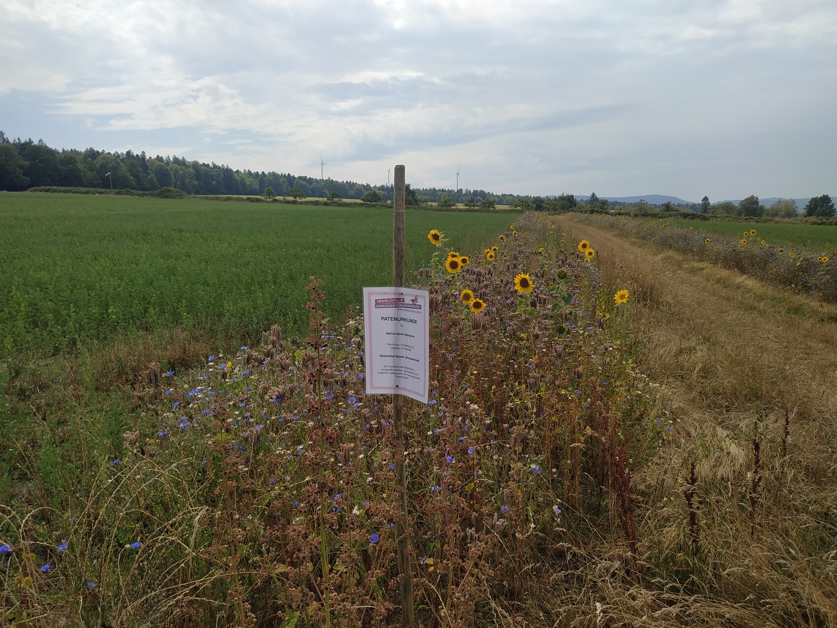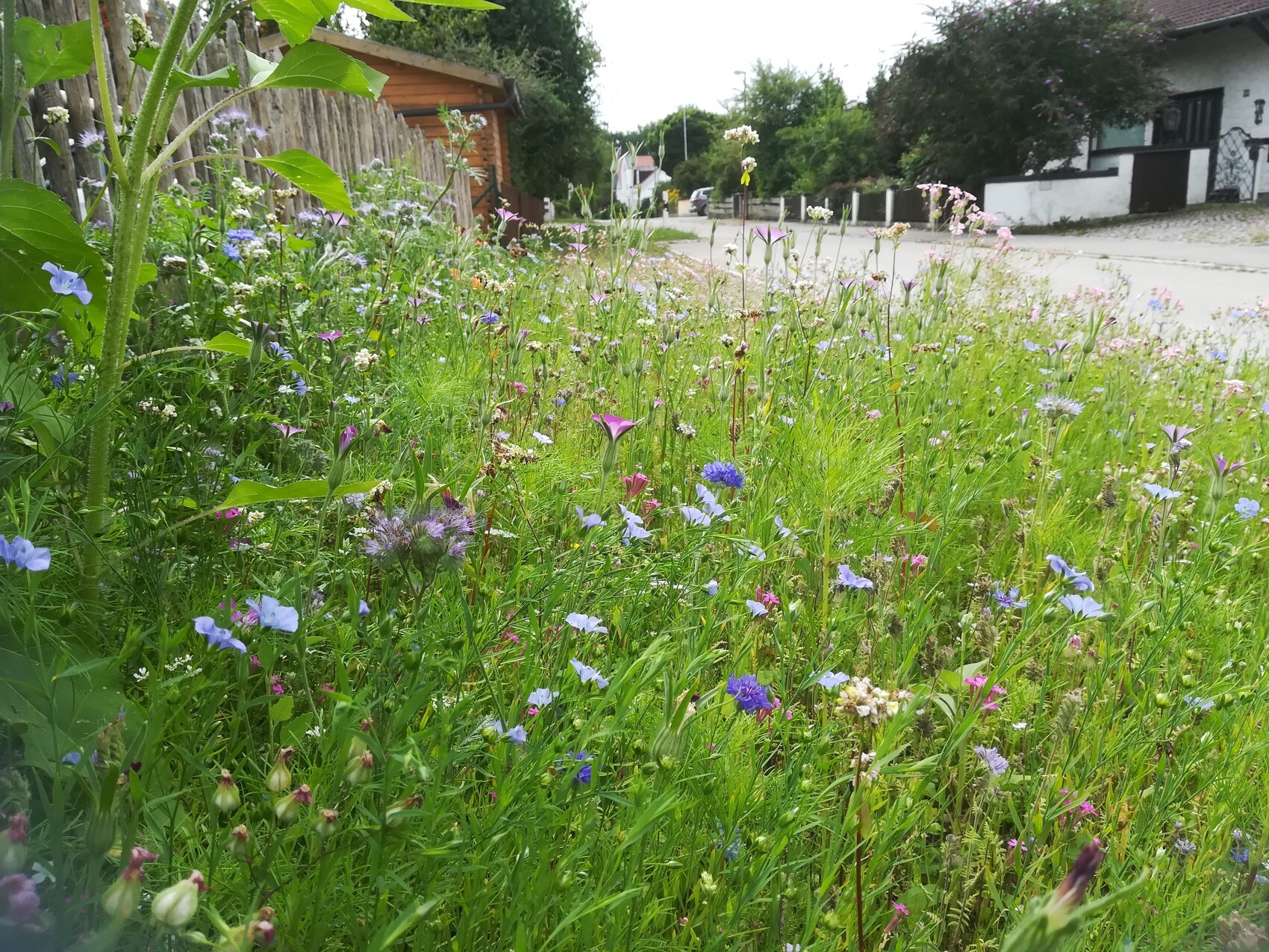 Ganz besonders freut mich die Blumenwiese vor unserem Grundstück. Da war ja so ein kleiner Bereich, der der Gemeinde gehört und den wir im Zuge des Baus vernichtet haben. Normalerweise ist da langweiliger Rasen drauf. Nachdem wir es wieder angelegt haben (klar, was ich kaputt mache, muß ich auch wieder instandsetzen), wollte ich dort aber keinen Rasen, sondern eine bienenfreundliche Blumenwiese. Ich habe einfach im Frühjahr so Streudosen mit Samen für diverse Blumenwiesen beim Aldi gekauft (1,99€ die Dose) und der Bereich wurde mit Mutterboden aufgefüllt und ich habe gesät. Etwas spät, weil es erst im Juni fertig wurde und ich war schon unsicher, ob da überhaupt was kommt, aber es kam und mittlerweile blüht immer wieder was anderes und es ist ein Summen und Brummen: