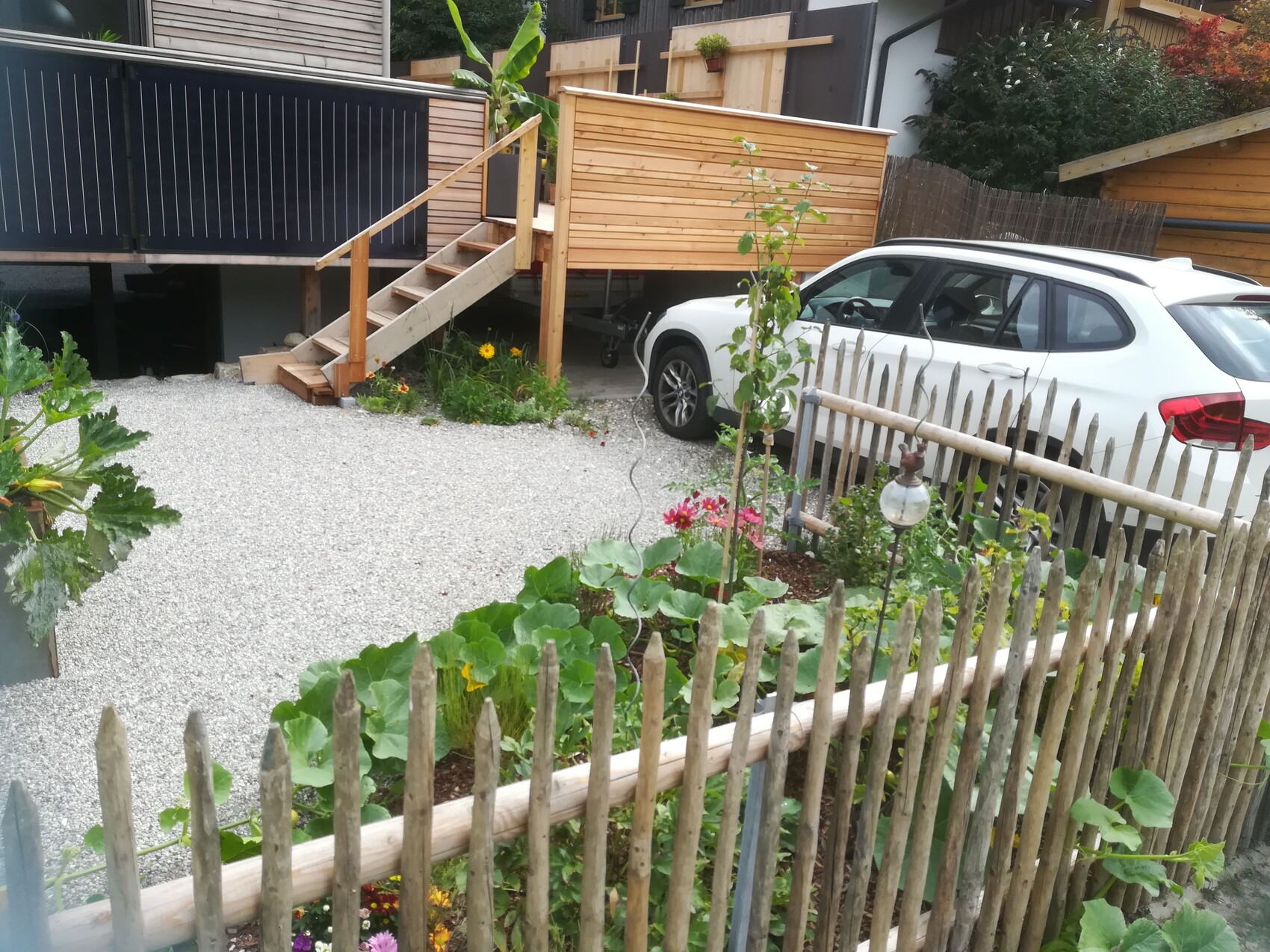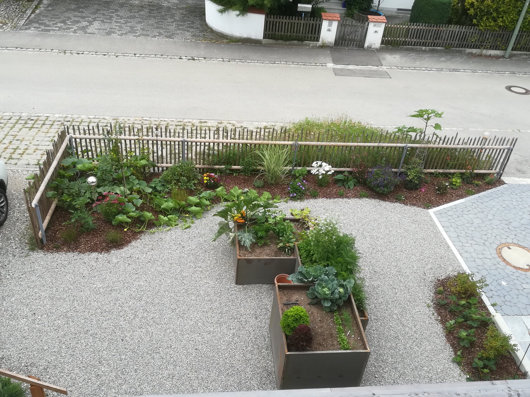 Gott sei Dank in der Ecke, in der eigentlich unsere Beerensträucher stehen - da ist die Ernte eh durch und der Kürbis darf sich den Platz nehmen.