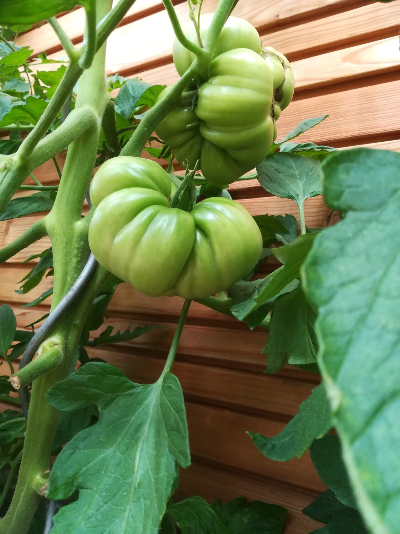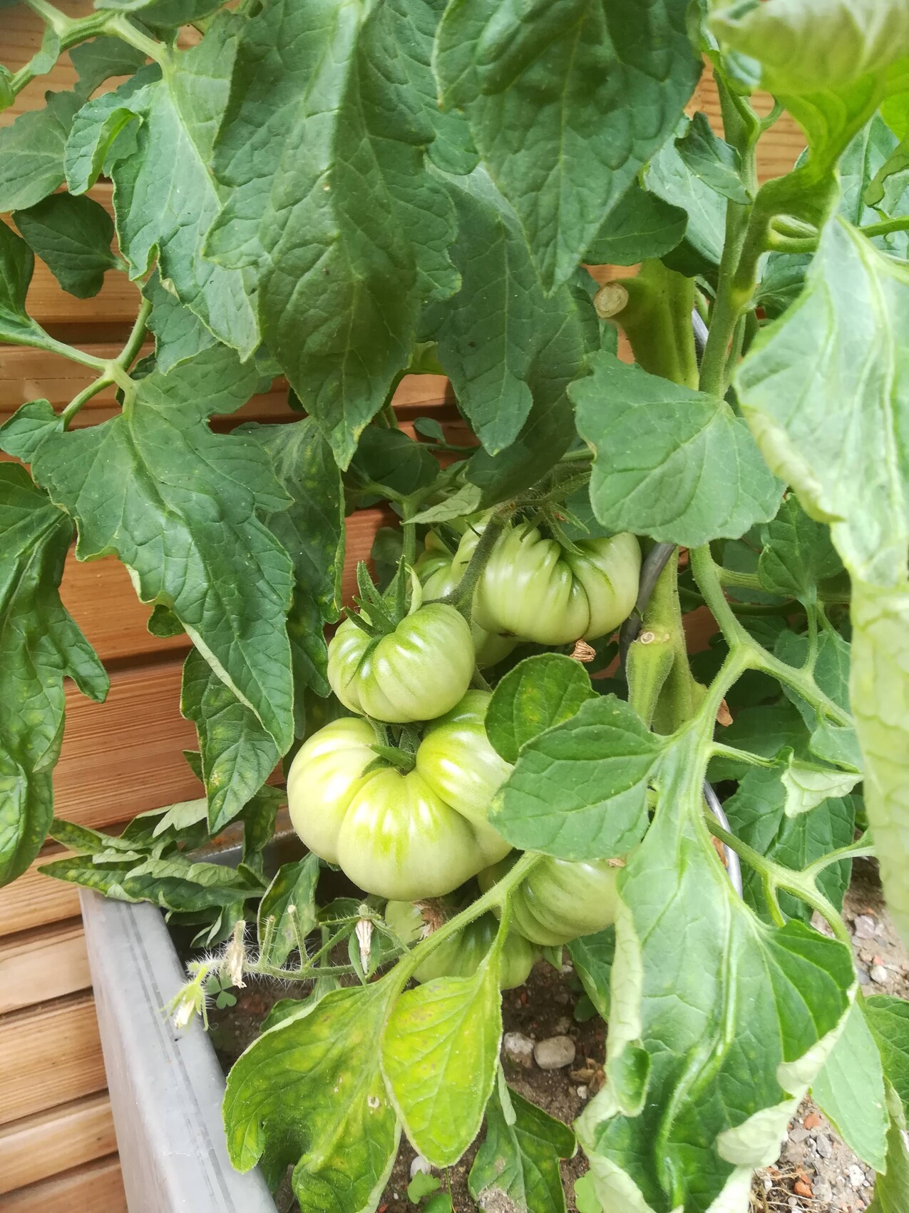 Außerdem habe ich noch Black Plum (eine dunkle Tomate), Ochsenherz orange und Green Zebra (gelb- grün geflammt). Jetzt schauen sie halt alle noch grün aus aber ich zapple schon, bis sie endlich Farbe kriegen.